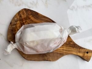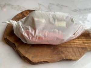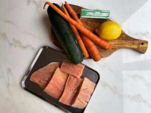 On parchment paper: zucchini → carrots → salmon → lemon & butter. Sprinkle salt, pepper. Wrap tightly.
