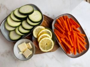Peel and cut carrots into strips, slice zucchini, lemon, and butter. -