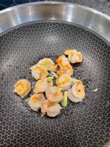 Heat oil in a pan, stir-fry some spring onion until fragrant, add the shrimp and cook over medium-high heat until both sides turn orange (about 70% cooked). Set aside.