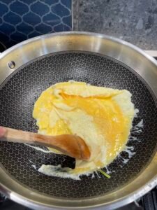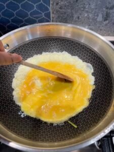 In the same pan, add another tablespoon of oil. Pour in the beaten eggs and cook over medium heat until lightly set with golden edges. Add shrimp and stir-fry briefly until fully cooked.