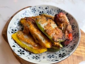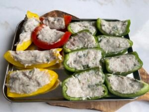 Fill each pepper cup with fish paste. Try to level the filling with the rim of the pepper for even frying.