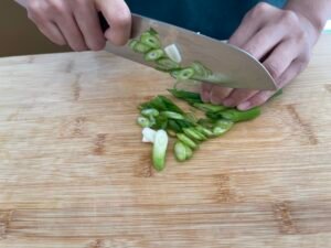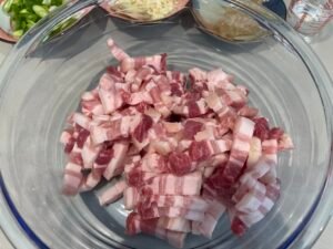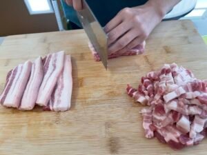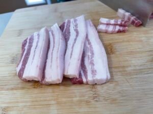 熱鍋,放入五花肉條。以中火翻炒至肉色變白,加入料酒繼續翻炒去腥。