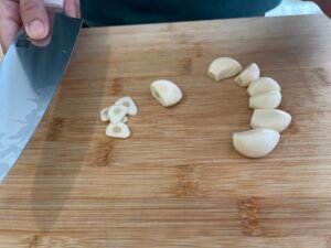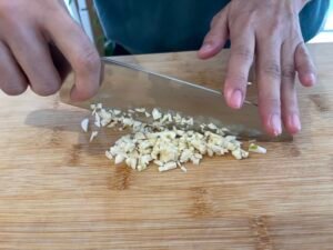 加入冰糖,翻炒至微黃上色(炒糖色)。加入紅蔥頭末爆香,隨後放入薑片與蒜末。