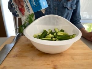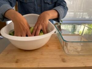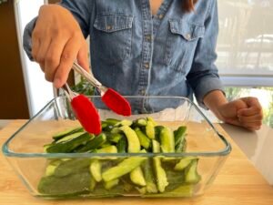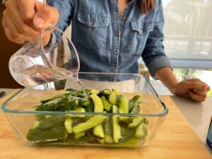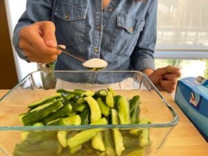 將青瓜洗淨,切條。加少許鹽,拌勻,靜置 10–15 分鐘。