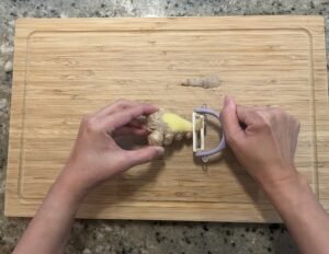 薑洗淨去皮,用刀拍鬆後放入鍋中,加水煮滾,轉中火煮10分鐘,讓薑味釋出。