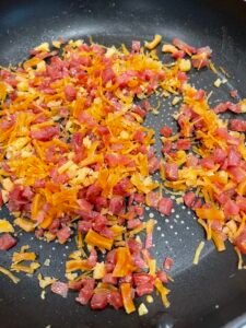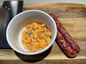 之後加入 一半炒香的臘腸、蝦米和瑤柱絲,拌勻。