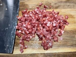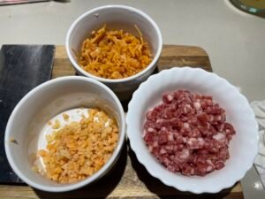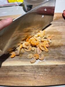 將浸軟的 瑤柱撕成絲,蝦米略切細,臘腸切碎。