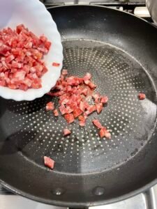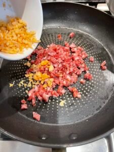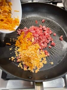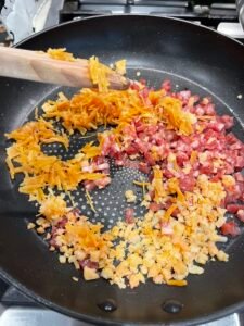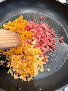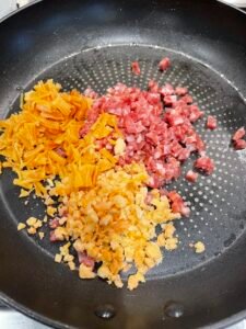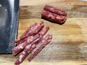 燒熱鍋後下少許油,將 臘腸、蝦米和瑤柱絲 炒香至略乾身,然後盛起備用。