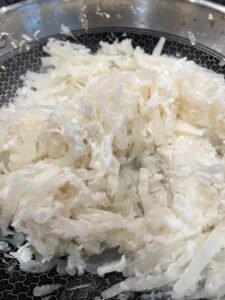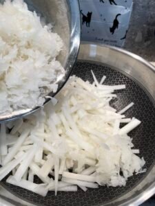將刨成絲的白蘿蔔放入鍋中煮至出水,蓋上鍋蓋,以 細火煮約15分鐘。煮出的 蘿蔔水同樣保留。