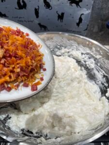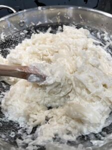 趁蘿蔔絲仍然熱時,將粉漿 分3次加入,一邊加入一邊不停攪拌。