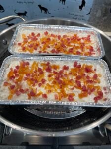 將蘿蔔糕漿倒入模具中,抹平表面,再撒上 剩餘一半的臘腸、蝦米和瑤柱絲。