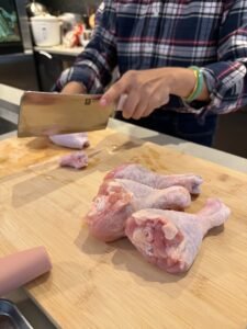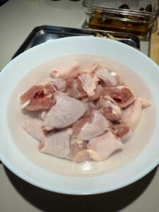 雞肉切件,用鹽水浸 5–10 分鐘去血水 → 抹乾 → 以豉油、糖、米酒醃 10–15 分鐘。