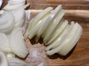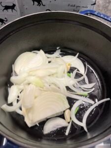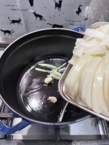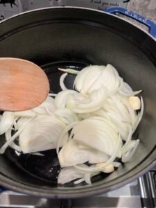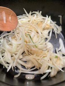 熱鍋下油,放入薑片與洋蔥炒至微軟出香味。