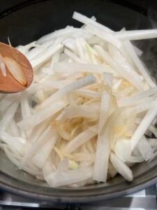 中小火炆約20–25分鐘,至蘿蔔變透明軟身。