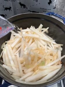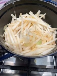 白蘿蔔去皮切條,洋蔥切絲, 蔥白切絲蔥切粒。