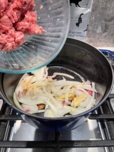 熱鍋下油,加入薑絲、蒜蓉、紅蔥頭、洋蔥炒香。