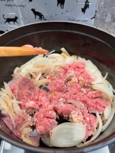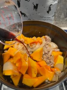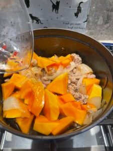 同一個鍋加入南瓜塊,加清水蓋過一半位置,中火煮約 5 分鐘。再煮 5–10 分鐘至南瓜軟腍、稍微收汁。