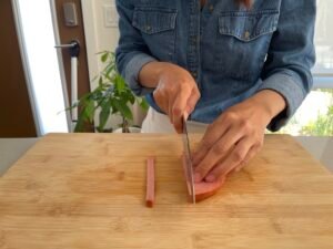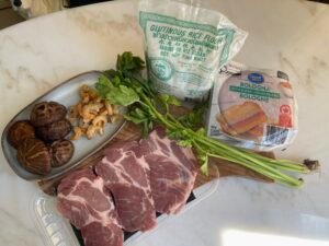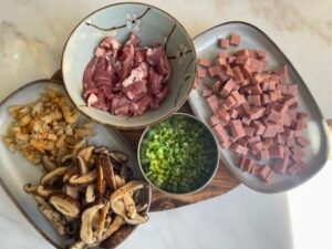 冬菇浸泡至軟,切片。火腿切粒,唐芹切碎,豬肉剁碎備用。