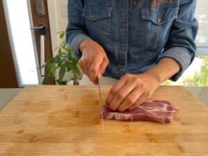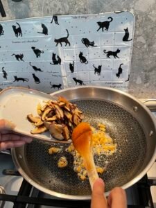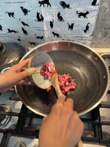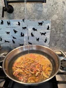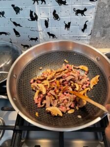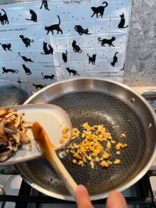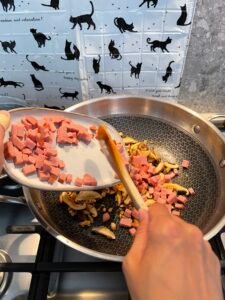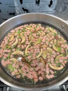 煮滾一鍋水或高湯,加入冬菇片、火腿丁、唐芹。加入豬肉,煮至熟透。