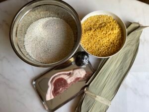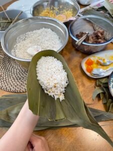 取兩片粽葉交叉重疊,摺成漏斗形;放入一層糯米、綠豆,再放入咸蛋黃與豬肉; 蓋上糯米後壓實,包好並用繩子綁緊。