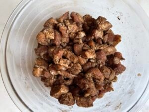 將糯米浸泡4小時、綠豆浸泡1小時。五花腩用五香粉、鹽、糖、生抽醃最少2小時。