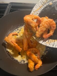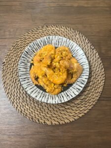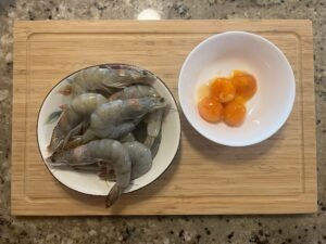 這道黃金蝦是我很喜歡的一道菜。以前家裡過節或有客人來時,媽媽總會煮這道菜,香氣一出,全家人都圍過來。那時候的我最喜歡在旁邊看她炒鹹蛋黃起泡,像金色的泡泡一樣,一下子就讓整個廚房充滿香氣。現在我自己煮的時候,也會想起那份熟悉的味道和家的溫暖。