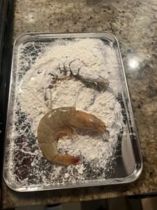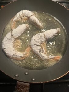 蝦沾上生粉半煎炸至金黃色並拿起備用。
