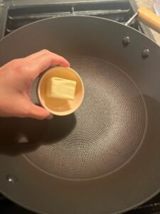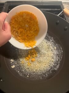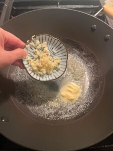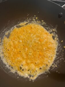 中細火下牛油,落蒜蓉爆香再下鹹蛋黃慢慢拌勻,炒至鹹蛋黃起泡。