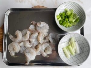 鍋中下油,加入部分蔥段爆香,然後加入蝦仁,中大火煎至兩面橙色、約七成熟,撈起備用。