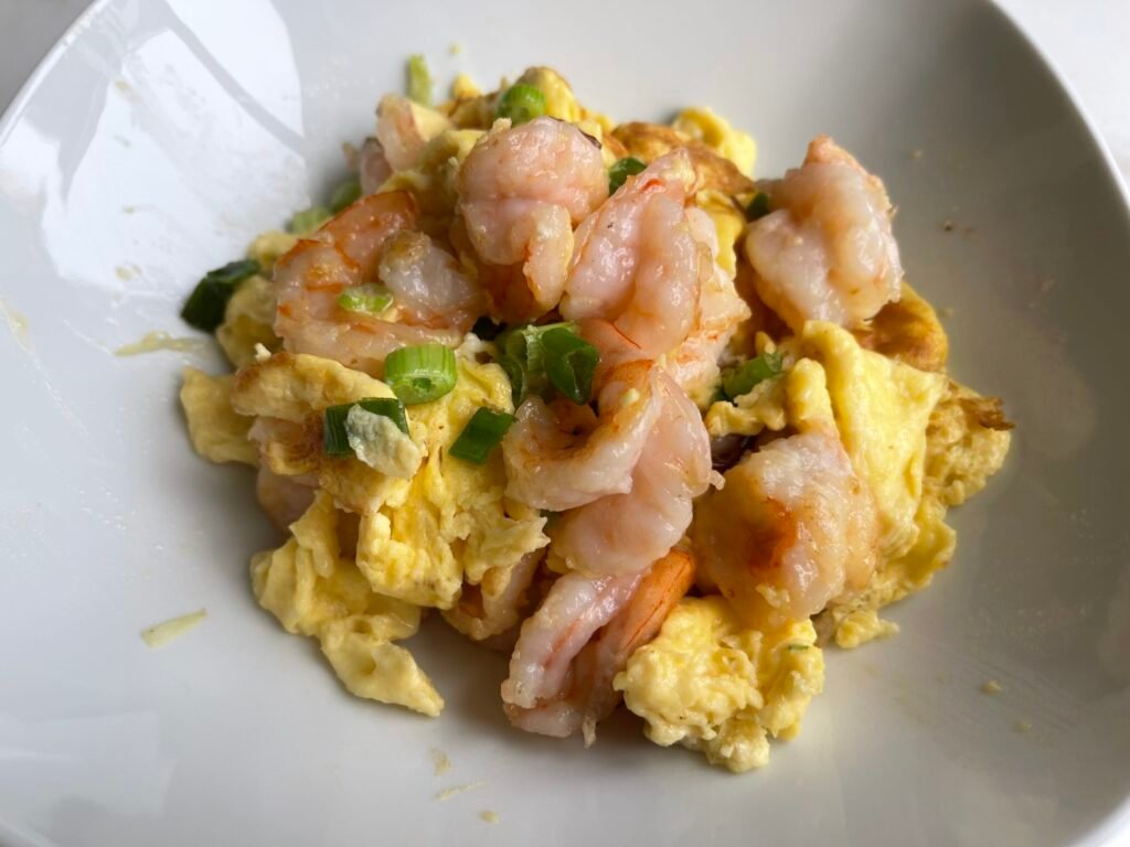 用同一鍋再下油(約 1 湯匙),中火加熱,倒入蛋液煎至略熟(金黃色邊),加入蝦仁快速拌炒至全熟即可。