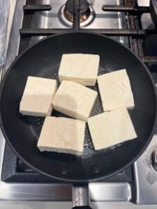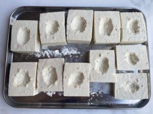 將豆腐切成約2厘米厚的長方形,吸乾水分,並在表面灑少許鹽。