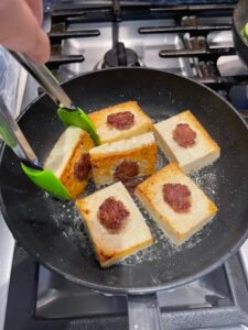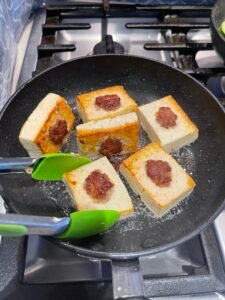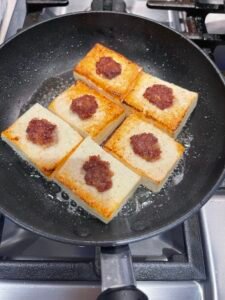 預熱易潔鑊或不鏽鋼鑊,加少許油。將釀豆腐以「肉向下」放入鑊中,以中火煎約3-4分鐘,至金黃色。翻轉後再煎另一面。