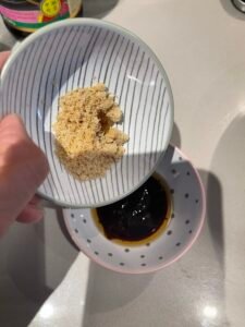 混合所有醬汁材料(豉油、糖、蠔油、麻油、水),煮滾後加入生粉水拌成芡汁。 -