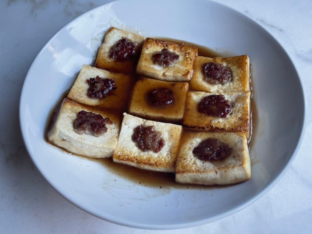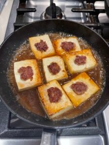 將煎好的釀豆腐放入醬汁中,煮約1-2分鐘至入味,關火即可上碟。