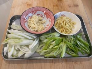 大蔥切段(分白、青兩部分),薑及蒜頭切碎。