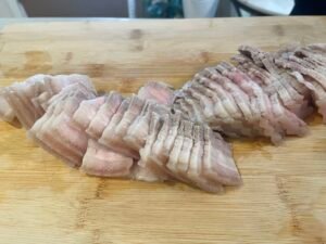 五花腩肉冷水落鍋,加薑片、少許米酒,水滾後轉中小火煮約20分鐘,至肉熟透。取出放涼後切成約2毫米厚嘅薄片。