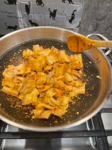 熱鍋下少許油,放入切好嘅五花肉片,開中火快炒,再放入薑末蒜末炒勻,然後加入豆瓣醬炒香,讓肉片均勻裹上醬香。