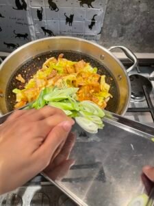 下大蔥白段先炒一炒,再加生抽調味,最後下青蒜青段快炒幾下。