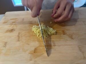 大蔥切段(分白、青兩部分),薑及蒜頭切碎。