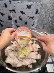 熱鍋下少許油,放入切好嘅五花肉片,開中火快炒,再放入薑末蒜末炒勻,然後加入豆瓣醬炒香,讓肉片均勻裹上醬香。