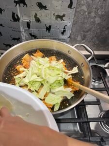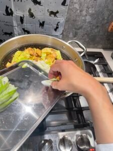 下大蔥白段先炒一炒,再加生抽調味,最後下青蒜青段快炒幾下。